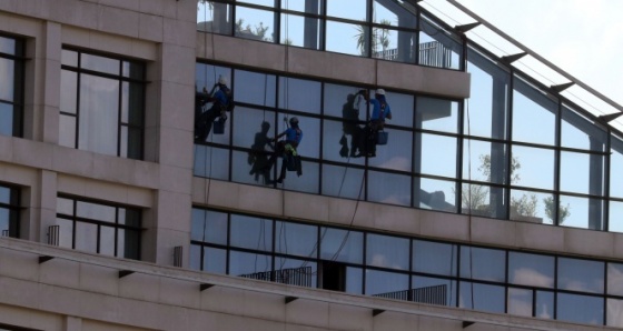 "Çift ip sistemiyle yüksek güvenlikle çalışıyoruz" Çalışmalara ilişkin bilgiler aktaran Özkarakaş, “Çift ip sistemi kullanıyoruz. Birbirinden bağımsız, 2 noktada bağlı emniyet ipinden oluşuyor. Biri çalışma ipi, diğeri de kurtarmalar ya da düşüş esnasında düşmeyi durduracak ikinci ip. Temizlik esnasında özel solisyonlu sıvılar taşıyoruz. Bu sıvıları kirli yüzeye uyguladıktan sonra peluş ve çek çek yardımıyla genel temizliği sağlayıp, bezle kurulayıp aşağı doğru inişe geçip yukarıdan aşağı bir temizlik çalışması yürütüyoruz” dedi.