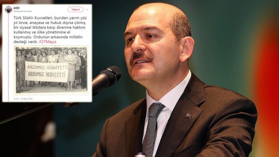 Türk Silahlı Kuvvetleri, bundan yarım yüz yıl önce, anayasa ve hukuk dışına çıkmış bir siyasal iktidara karşı direnme hakkını kullanmış ve ülke yönetimine el koymuştu. Ordunun arkasında milletin desteği vardı. #27Mayıs pic.twitter.com/QQXIFei7xc— ADD (@add_genelmerkez) 27 Mayıs 2018Bugün bir derneğin 27 Mayıs’ta yapılanları öven bir afişi kendi resmi twitter hesabından paylaştıklarını öğrendiklerini belirten Soylu, ‘’Tabii şimdi teyit edemedim. Ben de yaklaşık bir saat önce muttali oldum. Bu hakikaten resmi bir twitter hesabı mıdır? Arkadaşlara onu araştırmaları talimatını verdim. Hem Bakanlık olarak suç duyurusunda bulunacağız hem de dernekler masası olarak hemen soruşturma başlatacağız." dedi.