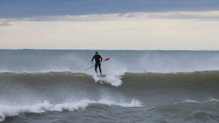 Denizin dalgalı olmasını fırsat bilen sporcular, Keykubat Plajı'nda sörf yaptı.