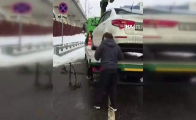 Rusya’nın başkenti Moskova’da bir sürücü, çekiciye yüklenen otomobiline binerek kaçırdı.