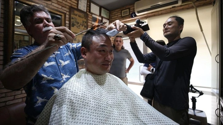 Ateşle tıraşın ardından makasla saça son şeklini veren berber Selahattin Aytekin ise Güney Kore'den gelen televizyon ekibine teşekkür etti.