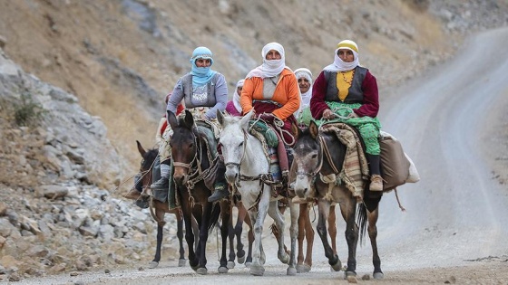 Katır sırtında vadi ve sarp kayalık yolları aşan kadınlar, üç saatlik yolculuğun ardından 3 bin rakımda koyunların otlatıldığı yaylalara ulaşıyor.