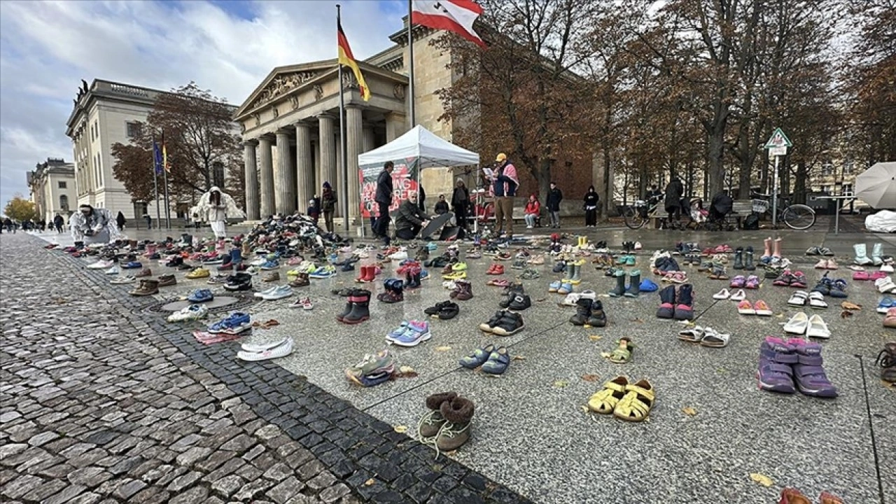 Gösteride ölen çocukların isimleri okundu ve Unter den Linden Caddesi’nin kaldırımına Gazze’deki soykırıma dikkati çekmek için yüzlerce çift çocuk ayakkabısı bırakıldı.