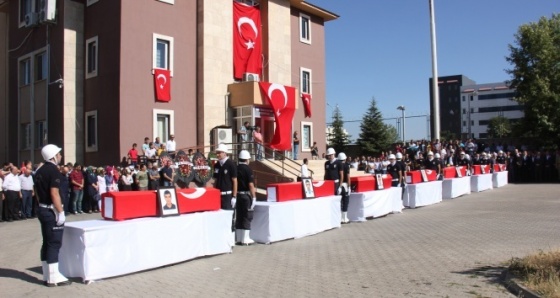 PKK’lı teröristlerce yol kenarına park edilen bomba yüklü aracın infilak ettirildiği saldırıda şehit düşen polis memurları Abdullah Bıyık, Yunus Emre Doğan, Hasan Koçer, Oğuz Sünbül, Bekir Deniz, Duran Melemir ve Osman Eray Karademir için Bingöl Emniyet Müdürlüğü bahçesinde tören düzenlendi. Şehit polislerin Türk bayrağına sarılı naaşları, meslektaşlarının omuzlarında katafalka konuldu, ardından öz geçmişleri okundu.