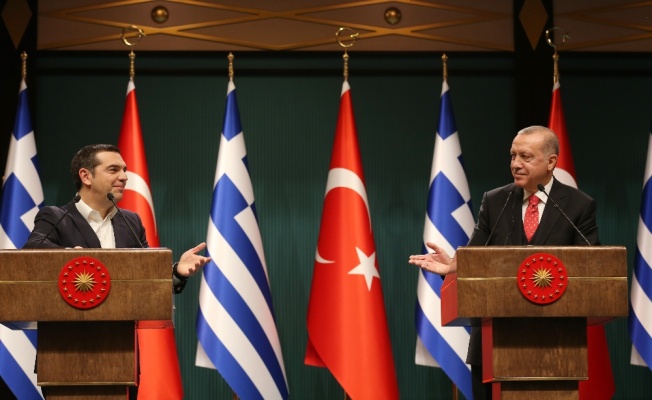 Türkiye’ye gelen Yunanistan Başbakanı Aleksis Çipras’ı Cumhurbaşkanlığı Külliyesi’nde kabul eden Cumhurbaşkanı Erdoğan, başbaşa ve heyetlerarası görüşmelerin ardından konuk Başbakan ile birlikte ortak basın toplantısında kameraların karşısına geçerek gazetecilerin sorularına cevap verdi.