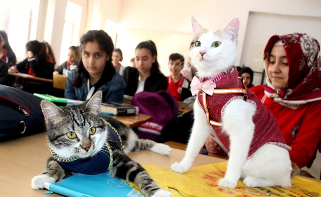 Adıyaman’da Gofret ve Miya adli kediler öğrencilerle birlikte derse giriyor.