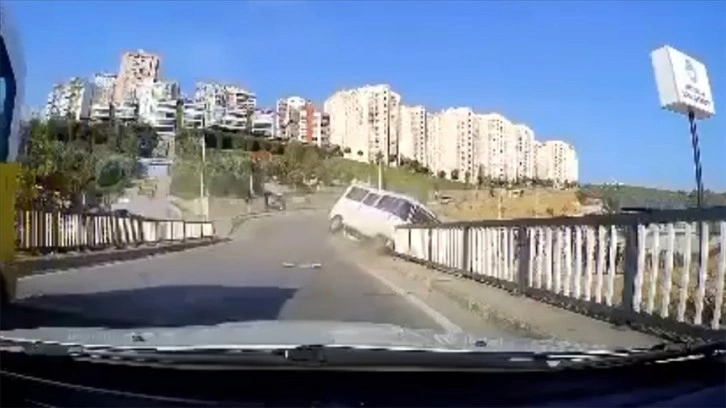 Karşı şeride geçen araç, Mandıras Deresi üzerindeki köprünün bariyerini yıkarak aşağıya düştü.