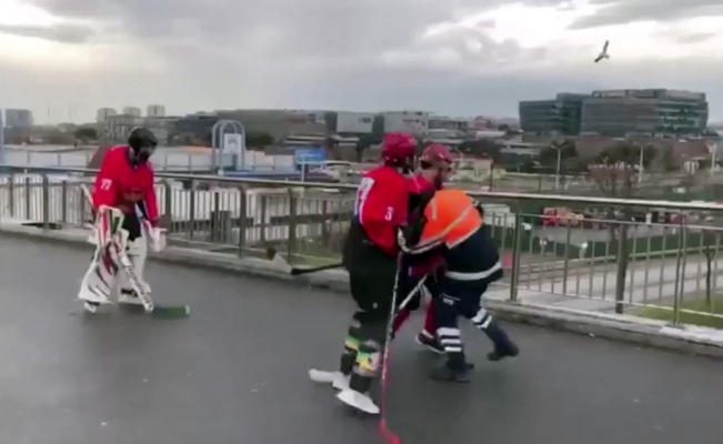 Buz hokeyi takımı antrenmana yetişmek için üstlerinde kıyafetleri ellerinde sopa ve ayakkabılarıyla metrobüse bindi. Çevredekilerin şaşkın bakışları altında yolculuk yapan metrobüsten inen takım, burada karşılaştıkları temizlik görevlisiyle hokey oynadı.