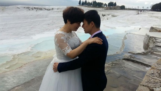 Çin'de evlenen 30 çift, balayı için UNESCO Dünya Miras Listesi'nde bulunan beyaz travertenleriyle ünlü Pamukkale'yi tercih etti.