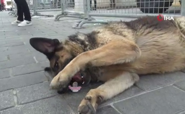 Taksim’de Toni isimli yaramaz köpek Arap çiftin küçük çocuğuna ait emziği kaparak emmeye başladı. Emziğini köpeğe kaptıran küçük çocuk ağlayarak annesinden emziğini kurtarmasını istedi.
