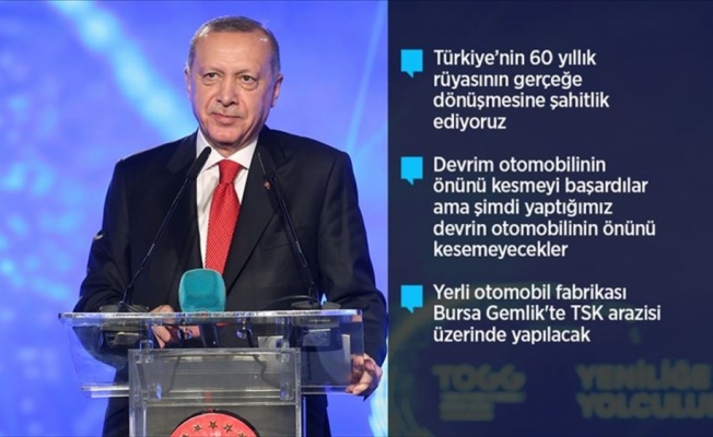 "Devrim otomobilinin önünü kesmeyi başardılar, devrin otomobilinin önünü kesemeyecekler" Cumhurbaşkanı Erdoğan, sözlerini şöyle sürdürdü: "Devrim otomobilinin yolda kalmasını, projeyi boğma kampanyasına çevirenler, aynı şeyi yapmaya çalışacaklardır. Ama izin vermeyeceğiz. Devrim otomobilinin önünü kesmeyi başardılar ama şimdi yaptığımız devrin otomobilinin önünü inşallah kesemeyecekler." "Söz verdik; 'İşçimizi enflasyona ezdirmeyeceğiz" Erdoğan, "İş başına gelirken söz verdik; 'İşçimizi enflasyona ezdirmeyeceğiz.' Şimdi de enflasyonun 3-4 puan üstünde belirleyerek yola devam ediyoruz" diye konuştu. Cumhurbaşkanı Erdoğan, "(Osmangazi Köprüsüne karşı çıkanlar) Bunlar sandalla karşıdan karşı geçmeye alışmışlar. Biz Körfezi dolaşarak değil, daha kestirme köprülerimizi yapalım, buralardan süratle İzmir'e ulaşalım." dedi. "Türkiye artık yeni teknolojilerin sadece pazarı değil, üreten, ihraç eden bir ülke haline geldi" Erdoğan, şunları kaydetti: "Türkiye artık yeni teknolojilerin sadece pazarı değil, bunları geliştiren, üreten ve tüm dünyaya ihraç eden bir ülke haline geldi. Öyle bir kampanya sürdürüyorlar ki, 'Bu fabrikalar çalışmasın, istediğimiz asgari ücreti belirleyelim.' Bu çark dönecek arkadaş... 170 bini aşan yazılımcı sayımızı hızla 500 binin üzerine çıkaracağız. Bizim sözümüz ne? Asgari ücrete işçimizi ezdirmeyeceğiz. Ezdirmedik bugüne kadar, bundan sonra da ezdirmemekte kararlıyız." "Yerli otomobil fabrikası Bursa Gemlik'te TSK arazisi üzerinde yapılacak" Cumhurbaşkanı Erdoğan, yerli otomobil fabrikasının Bursa Gemlik'te TSK arazisi üzerinde yapılacağını belirtti. Erdoğan, şöyle konuştu: "Aracımız sıfır emisyonla çalışarak çevreyi hiç kirletmeyecek. (Yerli otomobil) Kimseden lisans ve icazet almıyor, her türlü teknik özelliği kendimiz belirliyoruz. Oyunun kurallarını artık biz koyuyoruz."