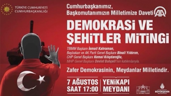 Tanıtım filminde, "Cumhurbaşkanımız ve Başkomutanımız Recep Tayyip Erdoğan, Demokrasi ve Şehitler Mitingi'nde milletimizle buluşuyor. Haydi Türkiye, 7 Ağustos Pazar 17.00'de, Demokrasi ve Şehitler Mitingi'nde Cumhurbaşkanımızla buluşmaya. Haydi Türkiye Yenikapı'ya." çağrısı yapılıyor.