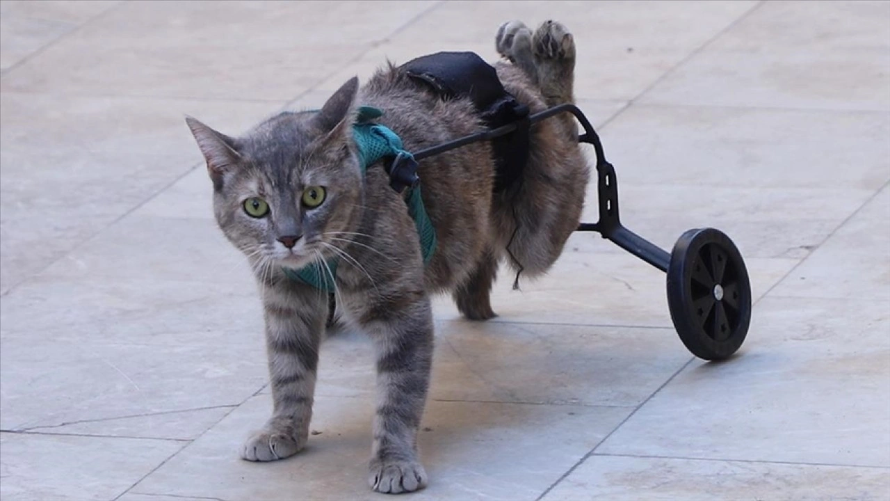 Omuriliğinde kırıklar nedeniyle iki ameliyat geçiren kedi, hayata tutundu ancak arka iki ayağı felç kaldı.