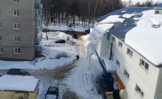 Zavoljsk şehrinde bir binanın çatısından kopan dev kar kütlesi, bir anda aşağı düştü. O sırada ise bir kadın binanın önündeki yolda yürüyordu. Neyse ki kar kütlesi kadını teğet geçti. Panik nedeniyle yere düşen kadın, olayı herhangi bir yaralanma yaşamadan atlatabildi.