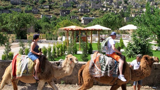 Muğla'nın Fethiye ilçesinde 95 yıl önce terk edildiği için "hayalet köy" olarak da bilinen Kayaköy'de deve turu yapmak isteyen turistler kuyruğa giriyor.