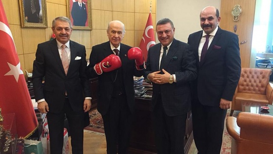 Federasyondan yapılan açıklamaya göre, başkan Gözgeç'in yanı sıra asbaşkan Hasan Kartal ve yönetim kurulu üyesi Selçuk Uçan'ı makamında kabul eden Bahçeli, boks eldiveni giydi.