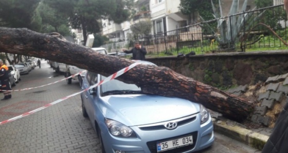 İzmir'in Karabağlar ilçesinde, kaldırımdaki çam ağacı park halindeki 2 otomobilin üzerine devrilerek hasara yol açtı.