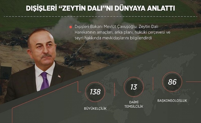 ANKARA (AA) - Dışişleri Bakanlığı, Bakan Mevlüt Çavuşoğlu başta olmak üzere tüm düzeyde Zeytin Dalı Harekatı'nın amaçları, arka planı, hukuki çerçevesi ve seyri hakkında ülkeler ve uluslararası kurumları bilgilendirdi.