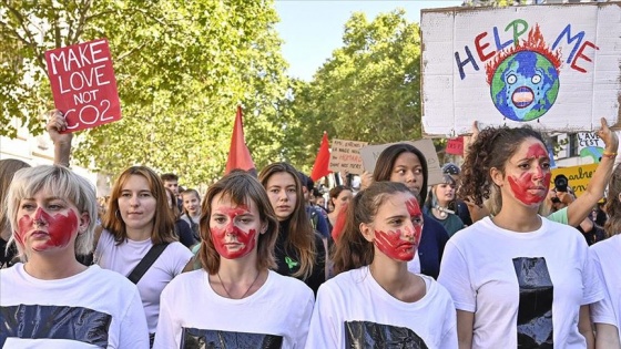 Çevreyle ilgili sloganlar atan ve renkli afişler taşıyan protestocular, küresel ısınma ve iklim değişikliğiyle mücadeleye yönelik politikalara öncelik verilmesini talep etti.