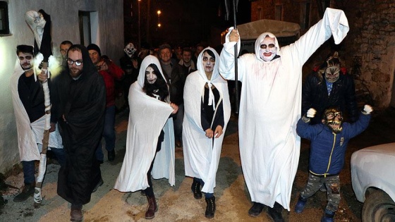 Çamlıca Kültür ve Turizm Derneği’ni bahçesinde toplananlar çeşitli maskeler taktı, dernek üyelerinin yardımıyla yüzlerini boyadı, beyaz çarşaf giydi.