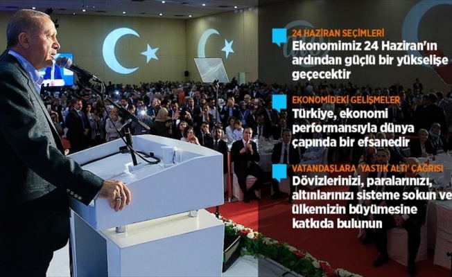 ANKARA (AA) - Cumhurbaşkanı Recep Tayyip Erdoğan, "Kur, faiz ve enflasyon sarmalıyla bozulmak istenen ekonomimiz, 24 Haziran'ın ardından yeni ve çok daha güçlü bir yükselişe geçecektir." dedi. Cumhurbaşkanı Recep Tayyip Erdoğan, Ankara Ticaret Odası (ATO) tarafından ATO Congresium'da şehit aileleri ve gaziler onuruna verilen iftar programında konuştu.