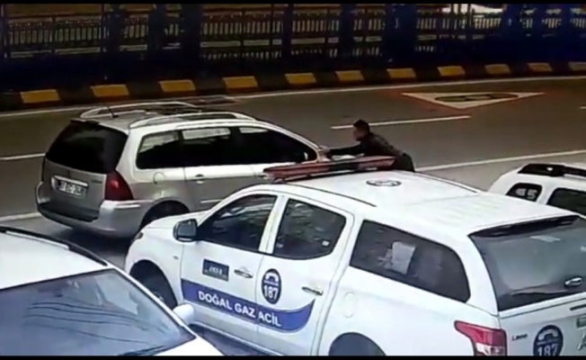 Trabzon’un Ortahisar ilçesinde marketten alışveriş yapmak için aracından inen şoför el frenini çekmeyi unutunca Yavuz Bayraktar isimli şahıs arabayı durdurmak için önüne geçti. Bayraktar’ın mücadelesi anbean kaydedildi.
