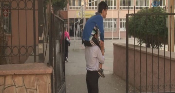 Manisa'da bir fırında işçi olarak çalışan Hüseyin Kandemir, kemik erimesi olan ve yüzde 65 engelli olan lise birinci sınıf öğrencisi 14 yaşındaki oğlunu her gün omuzlarında taşıyarak sınıfına kadar götürmek zorunda kalıyor.
