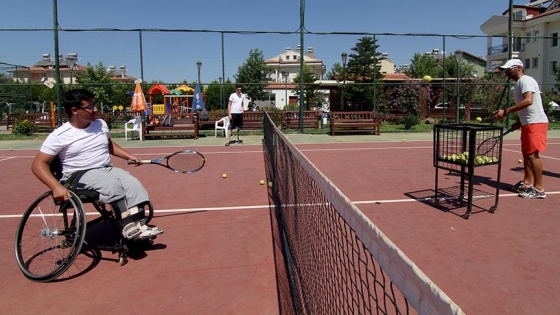 Muğla'nın Fethiye ilçesinde bedensel engelli sporculara tenis eğitimi veren Volkan Koyuncu, tekerlekli sandalyede oturarak antrenman yaptırıyor. - Anadolu Ajansı