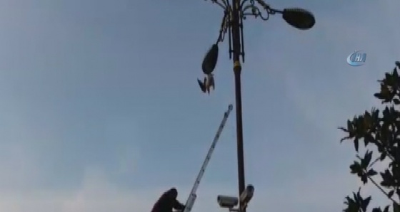 Cep telefonu kamerasına yansıyan görüntülerde, vatandaşların elektrik direğinin altında toplandığı görülüyor. Ardından camii bahçesine gelen itfaiye ekipleri elektrik direğine merdiven dayayarak martıya ulaşmaya çalışıyor. Merdivenin kısa gelmesi nedeniyle martıya ulaşamayan ekipler daha uzun bir merdiven getirerek direğe tırmanıyor. Ekipler martının sıkışan ayağını lambadan kurtarıyor.