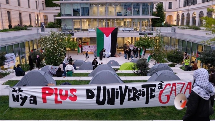 "Filistin'in onuru ve öldürülenler için Macron istemese de biz buradayız" şeklinde slogan atan öğrenciler, okulun bahçesinde çadır kurdu.