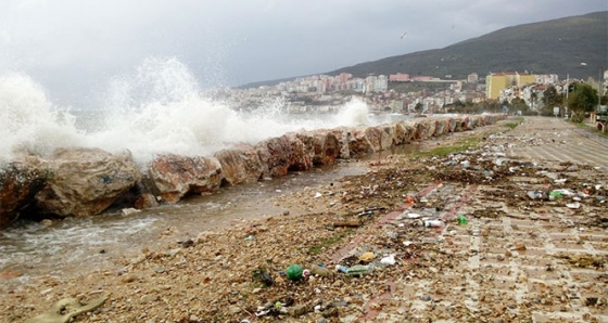 Gemlik'te şiddetli fırtına hayatı olumsuz etkilerken, denizde oluşan dev dalgalar kordon boyunu çöplüğe çevirdi. Gemlik sakinleri yaşanan durumu ibretlik olarak değerlendirirken, Belediye Temizlik işleri ekipleri gece geç saatlere kadar çalışarak sahili çöp deryasından temizledi.