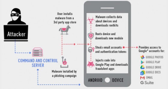 Gooligan, kimlik avı saldırısı Google Play harici üçüncü taraf uygulama mağazalarındaki uygulamalar ve kötü amaçlı bağlantı ve mesajlarla yayılır. Google Play, Gmail, Google Fotoğraflar, Google Dokümanlar, G Suite, Google Drive ve diğer programlardan gelen verileri ihlal etmek için kimlik doğrulama şifrelerini çalmak üzere uygulamayi cihaza indirir. Ayrıca, bu uygulamaların profilini yükseltmek için sahte derecelendirme ve incelemeler yayınlayarak hesap bilgilerinizi çalabilen bir başka uygulama yükler.