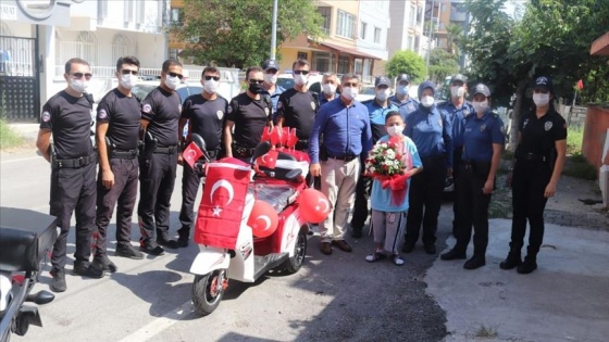 Temin edilen ve emniyet müdürlüğü binasına getirilen akülü motosiklet, ay-yıldızlı bayrak ve balonlarla süslenerek Kıbrıs'ın evine götürüldü.
