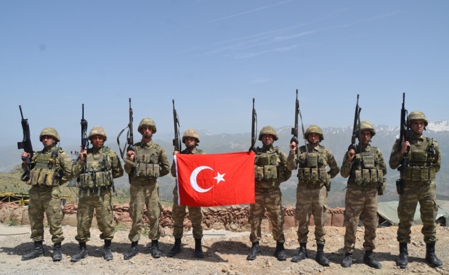 2 bin 30 rakımlı Karaçalı Hudut Bölüğünde konuşlanan silahlı kuvvetleri sarp arazisiyle baş döndüren dağlara rağmen teröristlere yönelik amansız mücadelelerini sürdürüyor. Ramazan bayramının 2’inci gününde bayramlaşan Mehmetçik, üs bölgesinin zirvesinde dalgalanan dev ay yıldızlı Türk bayrağı altında tüm Türkiye’ye mesaj gönderdi. Yüksek rakımlı dağ zirvesinde kurulan üs bölgesinde karların erimesinin ardından teröristlerin Türkiye’ye sızma girişimlerini önlemek amacıyla Kuzey Irak sınırında kalan topraklar gece gündüz gözetleniyor. Bir hareketlilik görüldüğünde ise tam isabet nokta atışlar yapılarak bölücü terör örgütü mensuplarına ağır darbeler veriliyor.