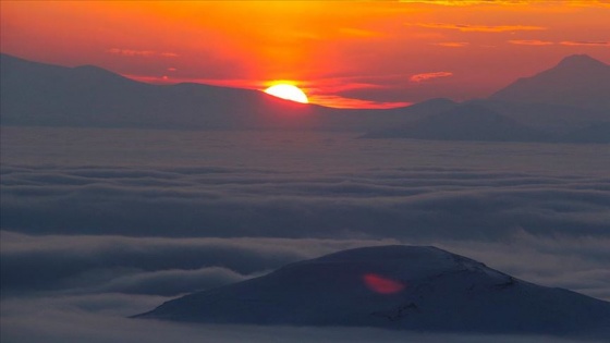 Güneş ışınlarıyla kızıl renge bürünen sis arasındaki Ağrı Dağı ise kartpostallık görüntüler oluşturdu.