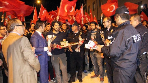İhbarın ardından ellerinde bayrak, çiçek ve ikramlarla beklemeye başlayan öğrenciler, bölgeye gelen polis ekiplerini hep bir ağızdan "En büyük polis bizim polis, şehitler ölmez vatan bölünmez, polise uzanan eller kırılsın" sloganlarıyla karşıladı.