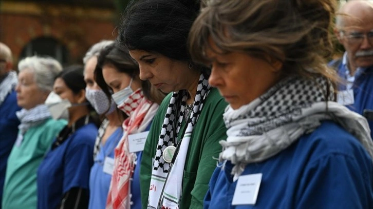 Hastane önünde üniformalarıyla bir araya gelen yaklaşık 179 doktor, hemşire ve sağlık teknisyeni, çoğunluğu Gazze'de olmak üzere Filistinli meslektaşlarının gözaltına alınmasına tepki göstererek, ellerinde "Gazze'deki doktorları serbest bırakın" yazılı pankartın yanı sıra yakalarında Filistinli sağlık çalışanlarının isimlerini ve ünvanlarını taşıdı.