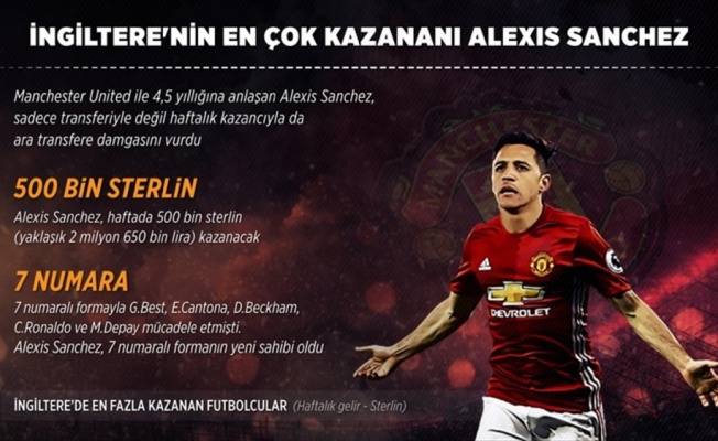 Portekizli teknik adam Jose Mourinho'nun teknik direktörlüğünü yaptığı Manchester United ile 4,5 yıllığına anlaşan 29 yaşındaki Şilili futbolcu, İngiliz basınında yer alan iddialara göre haftada kazanacağı 500 bin sterlinlik (yaklaşık 2 milyon 650 bin lira) geliriyle bu alanda zirveye yerleşti.