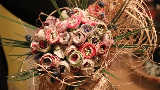Onu kestim, çiçek formuna getirdim. Takılar, yüzükler, tablolar yapıyoruz. Gelin çiçekleri, damat yaka çiçekleri, nikah şekerleri, hasır şapkalar süslüyoruz, hasır terlikler, hasır çanta. Yani yapamayacağınız bir şey yok gibi. Her şey var.