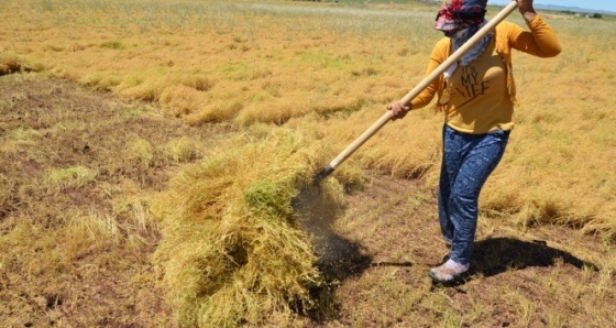 Güneydoğunun tahil ambarı olarak adlandırılan Şanlıurfa’da mercimek hasadı başladı. Çiftçiler mercimek hasadının başladığını belirterek, bu yılki mercimek veriminin bol yağış nedeniyle geçen seneki verimden daha fazla olduğunu söylediler. Sıcak havada çalışan işçiler ramazan ayından önce tarladaki işleri bitirmeye çalışıyor. Sabahın erken saatinde işe başlayan işçiler, günün en sıcak olduğu saatte ise buldukları gölgelere sığınıp dinleniyor. Kısa süreli bir yemek ve çay molasının ardından yine mesaiye başlayan işçiler, yaklaşık 40 dereceyi bulan sıcak havanın altında çalışmaya devam ediyor. Tarladaki tüm işlerini yoğun bir mesai ile bitirmeyi hedeflediklerini söyleyen çiftçi Aziz Başkurt, bu yılki mercimeğin veriminden memnun olduklarını dile getirerek, "Kasım ayında ektiğimiz mercimeğin bu ay verimini almaya başladık. Bizim 100 dönümlük tarlamız var. Eskiden tarlada tırpanlarla çalışıyorduk, bu da çok zor oluyordu ama şimdi imkanların iyileşmesiyle traktörün arkasına bağladığımız mercimek biçme makinesiyle yapıyoruz. Bu da bizim için çok rahat oluyor. Bu senenin verimi geçen seneye göre daha fazla. Geçen sene dönüm başına 450 ile 500 kilogram verim elde ederken bu sene dönüm başına 600 ile 700 kilogram gibi bir beklentimiz var. Bu artış bölgedeki düzenli yağışlardan kaynaklandı. Ramazan öncesi hasadı toplamazsak bayram sonrasına kalacağından hepsi bozulacak. Bu yüzden yoğun bir mesai harcayarak mercimekleri topluyoruz. Ramazan ayı başlamadan tüm işlerimizi bitirmeyi hedefliyoruz” dedi. Yıllarca köyde tarım işiyle uğraştığını ifade eden Veysi Sana “Bu yılki mercimeklerin iyi ve bereketli olacağını umuyoruz. Şu an tam mercimeklerin hasat zamanıdır. Bu yüzden ramazan ayı gelmeden yoğun bir çalışmayla bıçak ve patos işlerimizi bitireceğiz. Çiftçilerin işleri çok zordur. Gerçi eskiden tarlada tırpanlar ile çalışıyorduk ve bu da çok daha zor oluyordu ama şimdi imkanların iyileşmesiyle traktörün arkasına bağladığımız mercimek biçme makinesiyle yapıyoruz. Bu da işimizi rahatlıyor. Çiftçiler olarak devletin desteklerine her zaman ihtiyaçlarımız var. Allah-ü Teala tüm çiftçilere bol mahsul nasip etsin” şeklinde konuştu. Tarlada günlükçü olarak çalışan işçiler ise “Biz de burada günlük yevmiye karşılığında çalışıyoruz. Havaların sıcak olmasından dolayı işimiz biraz zor oluyor ama ekmek parası için bu zorluğa katlanmak zorundayız” ifadelerini kullandılar. Sabahın erken saatinde işe başlayan işçiler, günün en sıcak olduğu saatte ise buldukları gölgelere sığınıp dinleniyor.
