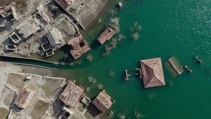 Isparta'da baraj sularının çekilmesiyle gün yüzüne çıkan taş evler görüntülendiIsparta'nın Sütçüler ilçesinde baraj sularının çekilmesiyle gün yüzüne çıkan taş evler görüntülendi.