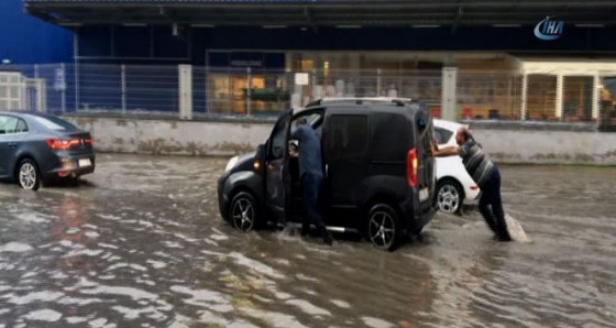 Bazı vatandaşlar ise araçlarını iterek göle dönen caddeden ilerlemeye çalıştı. Vatandaşlar göle dönen yollarda paçalarını sıvayarak yürümeye çalışırken, kimileri de yağmur suyunun ortasında bekleyip o anları cep telefonuyla kaydetti.