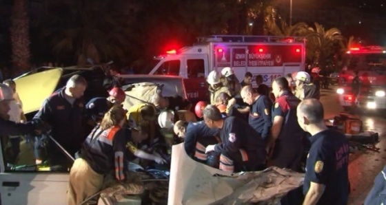 Kaza gece saat 03.00 sıralarında Mustafa Kemal Sahil Bulvarı Sabancı Kültür Merkezi önünde meydana geldi. Edinilen bilgilere göre Konak istikametinden Balçova istikametine seyir halinde olan 18 yaşındaki Uğur Bitiş'in kullandığı 35 N 2171 plakalı otomobil, sürücüsünün direksiyon hakimiyetini kaybetmesiyle kontrolden çıkarak karşı şeride geçti. Beton orta refüje çarparak karşı şeride geçen otomobil, Balçova yönünden gelen 26 yaşındaki Hasan Öztürk idaresindeki 45 DE 372 plakalı otomobille çarpıştı. Aynı esnada Balçova yönünden gelen sivil polislerin bulunduğu 35 LU 478 plakalı hafif ticari araçta hızını alamayarak bu iki otomobile çarptı. Kazayı gören çevredeki vatandaşlar durumu hemen 112 sağlık, 110 AKS ve polis ekiplerine bildirdi. Kazada, karşı şeride geçen otomobilin motoru yaklaşık 20 metre savrulurken, AKS ekipleri araçların içinde sıkışan yaralıları güçlükle çıkarabildi. Kazada ağır yaralanan Hasan Öztürk, Alsancak Devlet Hastanesine, 21 yaşındaki Öznur Ertaş Dokuz Eylül Üniversitesi Tıp Fakültesi Hastanesine, 18 yaşındaki Oğulcan Meriç Bozyaka Eğitim ve Araştırma Hastanesine, Uğur Bitiş ise Yeşilyurt Eğitim ve Araştırma Hastanesine kaldırıldı. Hastaneye kaldırılan yaralılardan durumu ağır olan Hasan Öztürk, yapılan tüm müdahalelere rağmen hayatını kaybetti. Kazada hafif şekilde yaralanan 2 sivil polisin tedavileri kaza yerinde yapılırken, yaralılardan Bitiş ve Ertaş'ın durumunun ağır olduğu, diğer yaralıların ise sağlık durumlarının iyi olduğu öğrenildi. Kaza ile ilgili soruşturma sürüyor.