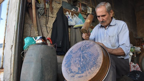 Adıyaman'da yaşayan 77 yaşındaki kalaycı Mehmet Baştemur, küçük yaşlarda başladığı mesleğini ilerleyen yaşına rağmen sürdürüyor.