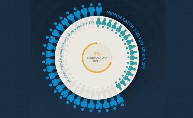 ANKARA (AA) - Kamuda sendika üyesi olabilecek 2 milyon 431 bin 228 çalışandan, 1 milyon 684 bin 323'ünün sendikaya üyeliği bulunurken, sendikalaşma oranı yaklaşık yüzde 70 düzeyinde seyrediyor.