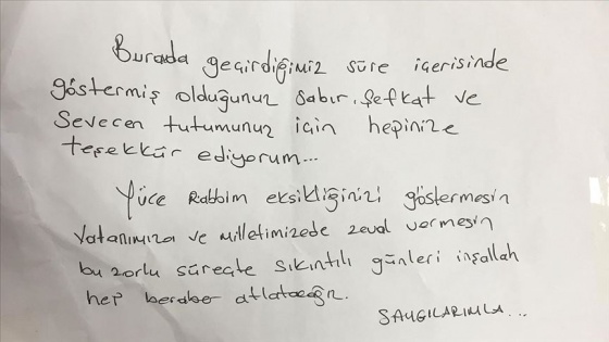 "Bu mektubu yazma ihtiyacı duyma sebebim, devletimizin yurtlarını kötüleyenler çok oldu. Hiç de öyle değil. Çok çok iyi. Bu yurtta karnım doyasıya yemek yedim. Sebebine gelince, bir kız çocuğunun kumbarasını bozdurup, Biz Bize Yeteriz kampanyasına katıldı. Bu beni çok etkiledi. Başta Cumhurbaşkanıma, devlet büyüklerime, burayı organize eden valime, sağlık müdürüne, il emniyet müdürüne, AFAD, Kızılay ve hizmet eden çalışanlara ayrı ayrı teşekkür ederiz."