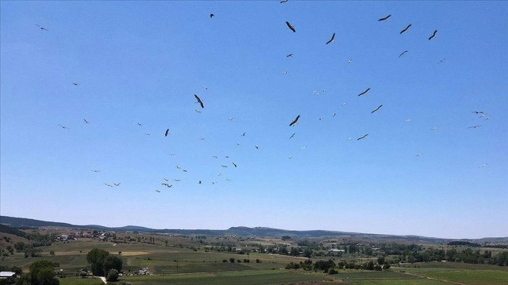 Sürekli değişik yönlere uçarak birbirlerinin arasına girip adeta dans eden leylekler, dronla görüntülendi.