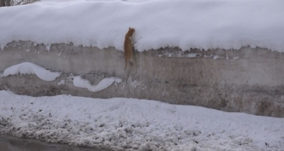 Kedinin tırmanış için uygun alan bulmaya çalışması kalın kar kütlelerine bakışı ve başarısız tırmanış girişimleri ise kameraya yansıdı.