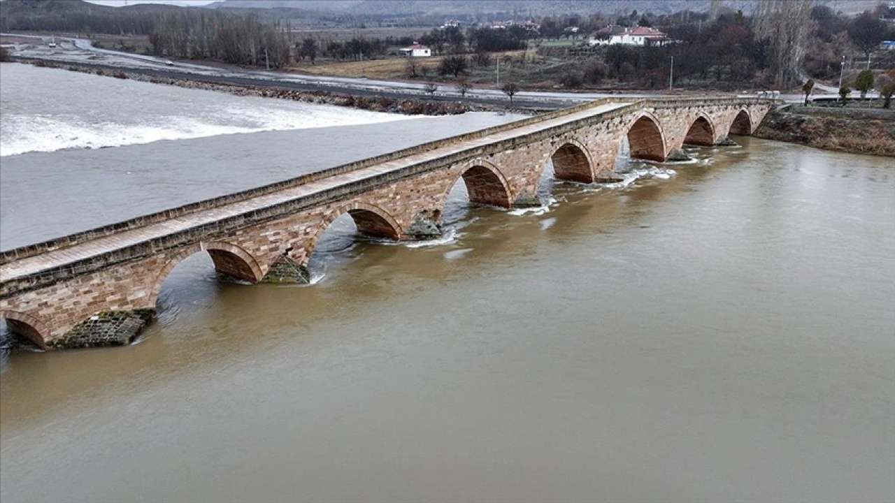Özellikle yaz aylarında kuraklık nedeniyle sadece birkaç kemerinden su akan köprünün 8 gözü, Kızılırmak'ın debisinin yağışlar ve kar sularının etkisiyle artmasıyla suyla doldu.
