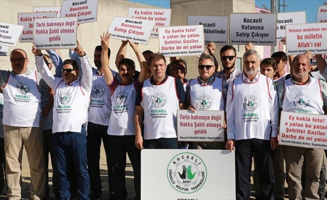KOCAELİ (AA) - Kocaeli'de 42 sivil toplum kuruluşu, vakıf ve derneklerin temsilcilerinden oluşan Kocaeli Gönüllü Kültür Teşekkülleri Platformu üyeleri, FETÖ'nün 15 Temmuz darbe girişimi sırasında Donanma Komutanlığındaki eylemlere ilişkin 53'ü tutuklu, 13'ü firari 92 sanığın yargılandığı Kocaeli Kapalı Ceza İnfaz Kurumları Yerleşkesinde sanıkları protesto etti.